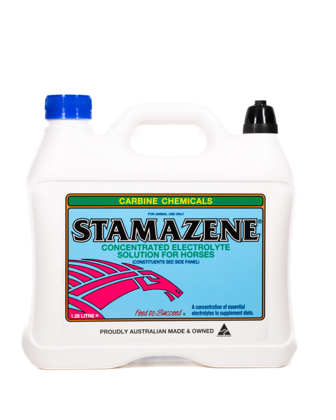 Concentrated oral electrolyte solution for horses. Stamazene is a salted caramel flavored feed supplement for all horses requiring a reliable intake of electrolytes, due to the salty flavor be sure to have fresh water available as the horse will be inclined to want to drink.