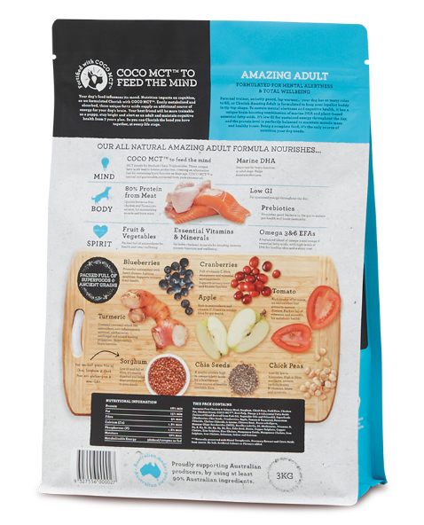 Cherish Amazing Adult is formulated to keep your loyalist buddy in tip-top shape. To sustain mental alertness and cognitive health, it has a unique brain boosting combination of marine DHA and plant-based essential fatty acids. It's low GI for sustained energy throughout the day, and the protein level is perfectly balanced to maintain muscle mass and healthy bones. Being a complete food, it's the only source of nutrition your dog needs.