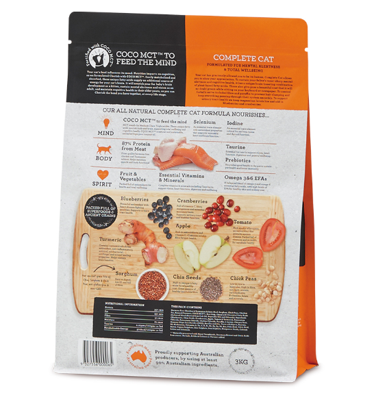 To sustain your feline's razor-sharp mental alertness and cognitive health, it has a unique brain-boosting combination of plant-based fatty acids. These also give puss a beautiful coat that it will no doubt groom while sitting on your keyboard or newspaper. To control furballs we've included fibre and paraffin to prevent hair clumping and keep everything passing through their system smoothly. To support urinary tract health we keep magnesium levels low and add in blueberries and cranberries.