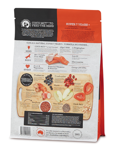 Cherish Super 7 Years + has a unique brain-boosting combination of marine DHA and plant-based essential fatty acids. As joints age and activity slows down, weight management is a priority. Our formulation includes glucosamine to support healthy cartilage and 80% lean quality protein from meat. To ensure your cherished companion always feels like a puppy at heart, we have a trio of ancient grains to provide low GI sustained energy and a rainbow of anti-oxidant rich superfoods.