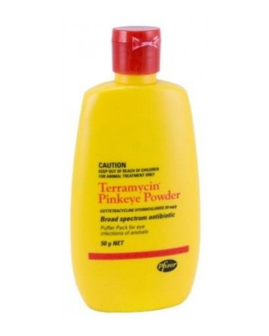 Terramycin Pinkeye Powder contains oxytetracycline hydrochloride 20mg/g in a non-irritant carrier. Broad spectrum antibiotic in a Puffer Pack for eye infections of animals. Terramycin is effective against Moraxella bovis and Rickettsia conjunctivae and has activity against a wide range of secondary invaders including Mycoplasma conjunctivae.
