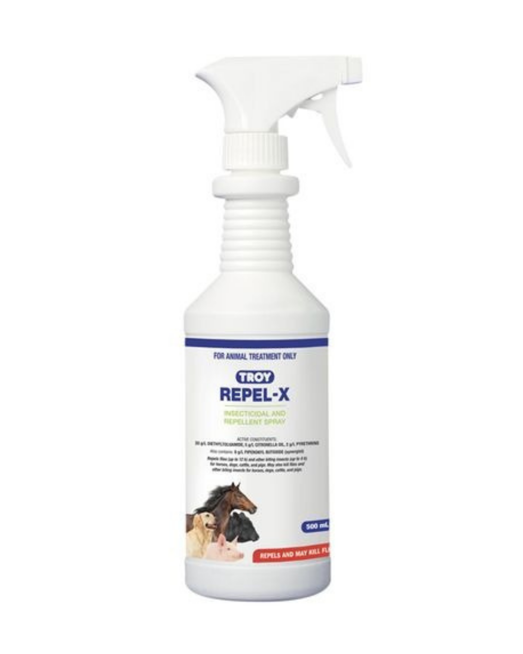 Troy Repel-X spray kills and repels flies and other biting insects on horses, dogs, cattle and pigs. Contains Piperonyl Butoxide, Citronella and Pyrethrins.